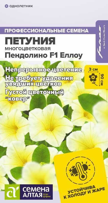 Раннецветущая петуния. Формирует густой цветочный ковер из множества миниатюрных нежно-желтых цветков с ярким центром. Хорошо переносит холод и жару, быстро восстанавливается после непогоды. Не требует удаления увядших цветков. Цветение непрерывное и продолжительное. Подходит для выращивания в грунте на клумбах, в подвесных кашпо, вазонах, балконных ящиках. Можно формировать как почвопокровное или ампельное растение. Высота растения: 20 см Длина плети: 75-90 см Диаметр цветка: 2,5-3 см Условия выращивания, место посадки: солнечные участки Требования к грунту: питательный легкий грунт, от слабо-кислого до нейтрального Способы выращивания: рассадный Время посева на рассаду: январь-март Способ посева: семена высевают на уплотненное ложе замоченных торфяных таблеток или увлажненного грунта, не заделывая. Драже увлажняют теплой водой до размягчения. Емкость накрывают прозрачной крышкой или пленкой до появления первых всходов, периодически проветривают. Обеспечивают досветку посевов не менее 10-12 часов в сутки и температуру 22-24°С Время до появления всходов: 3-5 дней Перевалка: производится через 2-3 недели от всходов в фазе 2-4 настоящих листьев. Объем индивидуальных емкостей не менее 0,5 л. При прорастании корней через дренажные отверстия перевалка в больший объем грунта. Диаметр окончательных емкостей должен быть не менее 14-20 см, оптимальный объем 10-15 л. Время высадки в открытый грунт: май-июнь, не менее 5-6 недель от посева Посадочное расстояние: 30-40 см Период цветения: май-сентябрь, через 5-6 недель после посева Уход: рекомендуется провести прищипывание побегов для стимуляции ветвления на 4-5 неделе. Первую подкормку проводят через 10-14 дней от появления всходов комплексным минеральным удобрением, далее – 1 раз в 7 дней. В начале бутонизации из подкормок убирают азот. Не допускать пересыхания субстрата! Внимание! Семена дражированные, оболочку не разрушать, она растворяется при поливе!