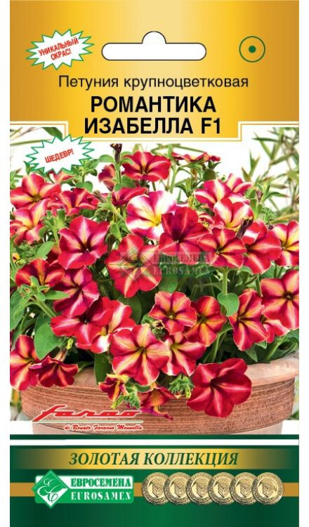 Романтика Изабелла - уникальная и долгожданная новинка, настоящий прорыв в селекции сегмента крупноцветковых петуний с двухцветной, просто ошеломляющей, окраской неповторимых цветков! Петуния с такой окраской, благодаря гену мужской стерильности, непрерывно и обильно цветет с ранней весны до поздней осени, производит огромное количество цветков в течение всего периода вегетации, способна к интенсивному ветвлению. Универсальный гибрид крупноцветковой петунии для выращивания рассадным способом, с прекрасной адаптацией к широкому диапазону температур, от минус 5°С до плюс 40°С, не прекращающий свой рост даже при низких температурах. Отличается устойчивостью растений к серой гнили и идеально подходит для всех видов использования: для горшков, контейнеров, подвесных корзин, различных цветников открытого грунта. Всеобщая любовь и долголетие ей обеспечено. Идеальный семенной материал с высокими показателями всхожести и сортовой чистоты.