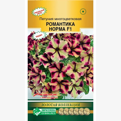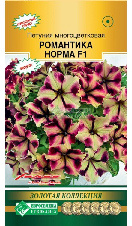 Романтика Норма - настоящий прорыв в селекции сегмента многоцветковых петуний с ошеломляющей окраской неповторимых цветков! На одном растении можно увидеть бахромчатые цветочки разных оттенков в зависимости от температуры и освещенности окружающей среды: то они пурпурно-желтого цвета, то пурпур переходит в задумчивый фиолетовый оттенок, а то и совсем перестают светиться золотым светом и уходят в глубокий философский бархат. Петуния с такой окраской, благодаря гену мужской стерильности, непрерывно и обильно цветет с ранней весны до поздней осени, производит огромное количество цветков в течение всего периода вегетации, способна к интенсивному ветвлению и даже росту при низких температурах. Идеально подходит для всех видов озеленения.
