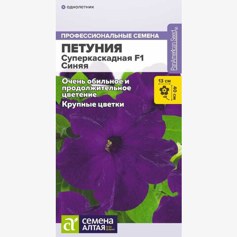 Петуния каскадного типа с невероятно крупными цветками темно-синей окраски. Растение хорошо ветвится, образуя мощный декоративный кустик. Можно выращивать в вазонах, контейнерных, использовать в массовых и одиночных посадках на клумбах. Цветение яркое и продолжительное: с весны до конца лета. Высота растения: 25-40 см Ширина растения: 25-30 см Диаметр цветка: 10-13 см Условия выращивания, место посадки: солнечные участки Требования к грунту: питательный легкий грунт, от слабокислого до нейтрального Способы выращивания: рассадный Время посева на рассаду: февраль-март Способ посева: семена высевают на уплотненное ложе замоченных торфяных таблеток или увлажненного грунта, не заделывая. Драже увлажняют теплой водой до размягчения. Емкость накрывают прозрачной крышкой или пленкой до появления первых всходов, периодически проветривают. Обеспечивают досветку посевов не менее 10-12 часов в сутки и температуру 22-24°С, растение хорошо реагирует на более длительный период досветки Время до появления всходов: 3-5 дней Перевалка: производится через 2-3 недели от всходов. Объем индивидуальных емкостей не менее 0,5 л. При прорастании корней через дренажные отверстия перевалка в больший объем грунта. Диаметр окончательных емкостей должен быть не менее 25-30 см. Время высадки в открытый грунт: май-июнь, не менее 5-6 недель от посева Посадочное расстояние: 30-40 см Период цветения: май-август Уход: рекомендуется провести прищипывание побегов для стимуляции ветвления на 4-5 неделе. Первую подкормку проводят через 10-14 дней от появления всходов комплексным минеральным удобрением, далее – 1 раз в 7 дней. В начале бутонизации из подкормок убирают азот. Не допускать пересыхания субстрата! Внимание! Семена дражированные, оболочку не разрушать, она растворяется при поливе!