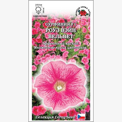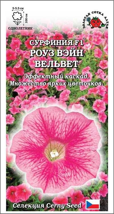 Ампельная гибридная петуния типа сурфиния. Необыкновенно красивое растение, формирующее эффектный каскад плетей длиной до 100 см и более, сплошь покрывается множеством воронковидных цветочков нежно-розового цвета с четкими темно-розовыми прожилками. Великолепно смотрится в подвесных кашпо, вазонах и балконных ящиках, с успехом используется для создания ковровых цветников.