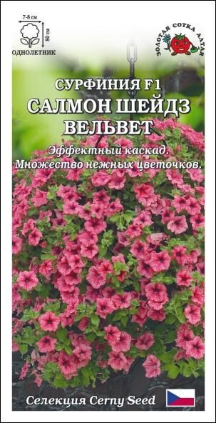 Ампельная гибридная петуния типа сурфиния. Необычайно красивое растение, формирующее эффектный каскад плетей длиной до 80 см и более, сплошь покрывается множеством воронкообразных цветочков различных оттенков лососевого цвета. Великолепно смотрится в подвесных кашпо, вазонах на ножке и балконных ящиках, с успехом используется для создания ковровых цветников.