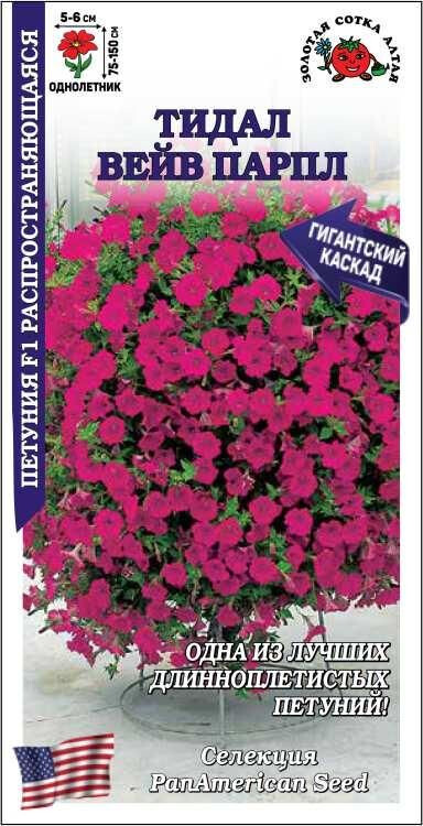 Tidal Wave (Приливная волна) – отличная серия для больших (от 10-15 л до 200 л) контейнеров и кашпо, а также ландшафтного озеленения, выделенная в отдельный вид ампельных петуний под названием Petunia Hedgiflora. Растение необычайно мощное, не имеющее аналогов среди петуний, способно занять площадь около полутора квадратных метров, при высоте 40-55 см. Ветвистые плети, с легкостью достигающие длины 1,5 метров, сплошь покрыты невероятно большим количеством цветов яркого пурпурного цвета. Для раскрытия всей мощи и красоты данного гибрида необходимо не менее 10 литров почвы на одно растение.