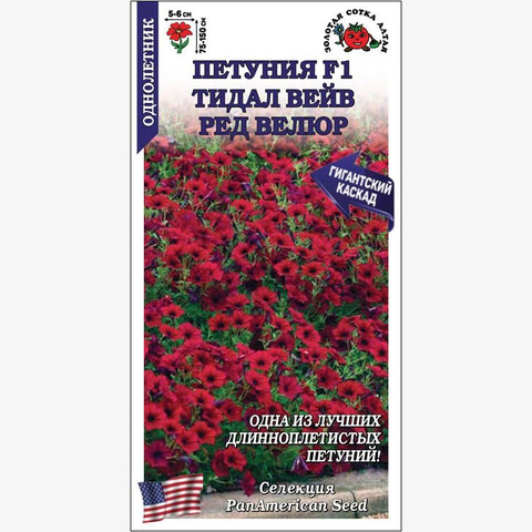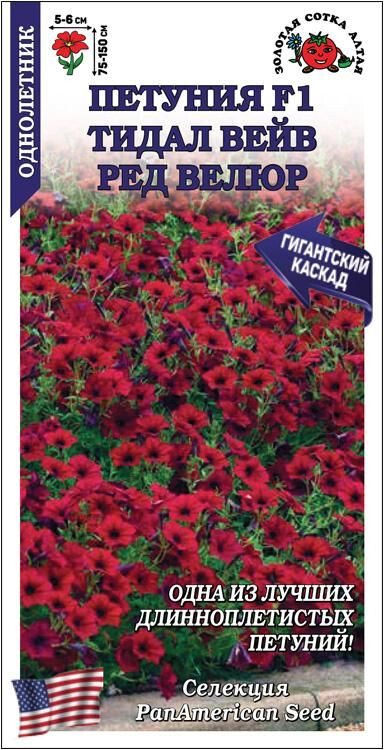 Петунии ТИДАЛ ВЕЙВ стойки к непогоде и болезням, цветут невероятно обильно. Растение необычайно мощное, способно занять площадь около полутора квадратных метров, при высоте 40-55 см. Ветвистые плети, с легкостью достигающие длины 1,5 метров, сплошь покрыты невероятным множеством густо-красных цветов. Великолепна в больших (от 10-15 л до 200 л) контейнерах и при создании ковровых цветников.