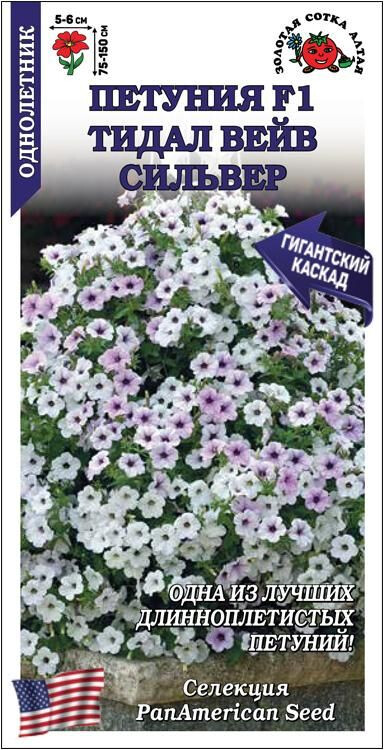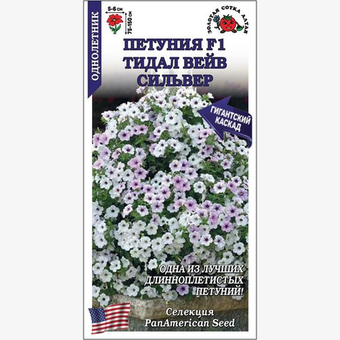 Tidal Wave (Приливная волна) – отличная серия для больших (от 10-15 л до 200 л) контейнеров и кашпо, а также ландшафтного озеленения, выделенная в отдельный вид ампельных петуний под названием Petunia Hedgiflora. Растение необычайно мощное, не имеющее аналогов среди петуний, способно занять площадь около полутора квадратных метров, при высоте 40-55 см. Ветвистые плети, с легкостью достигающие длины 1,5 метров, сплошь покрыты невероятно большим количеством цветов серебристо-белого цвета с фиолетовым центром и прожилками. Для раскрытия всей мощи и красоты данного гибрида необходимо не менее 10 литров почвы на одно растение.