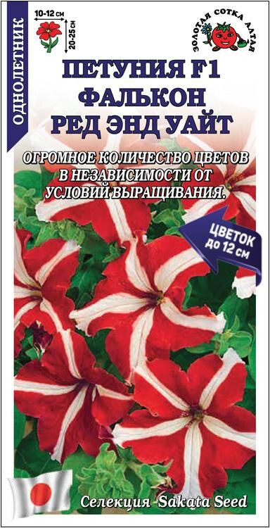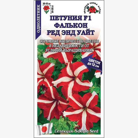 Гибриды серии Фалькон устойчивы к жаре, похолоданиям, дождю и ветру, зацветают очень рано и равномерно, цветут невероятно обильно с весны и до середины, а иногда и конца осени. Кустики компактные и аккуратные, с огромным количеством очень крупных цветов ярко-красной расцветки с белыми, расходящимися от центра лучами. Петунии одинаково прекрасны в цветниках, вазонах на ножке, кашпо и ящиках.
