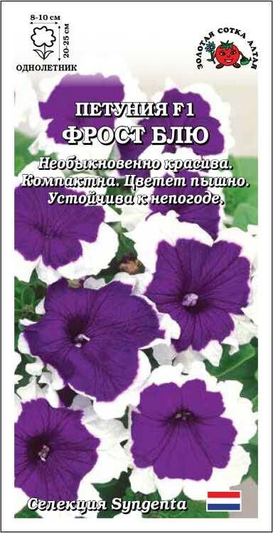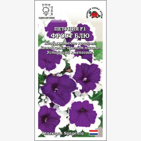 Очаровательная петуния, притягивающая взоры изумительно красивой контрастной расцветкой: белая кайма в сочетании с фиолетово-синим цветом венчика. Серия Фрост характеризуется ранним и пышным цветением, компактностью кустика и устойчивостью растений к любым капризам природы. Непревзойденное украшение цветников, прекрасно развивается и цветет в контейнерах.