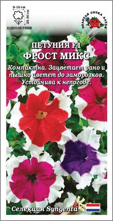 Петунии серии Фрост притягивают взоры необычайно красивой расцветкой: белоснежная кайма по краю венчика изумительно контрастирует с основной окраской цветка. Характеризуются компактностью кустиков и устойчивостью растений к засухе, дождю, ветру и палящему солнцу. Зацветают рано и пышно цветут до заморозков. Непревзойденное украшение цветников и контейнеров.