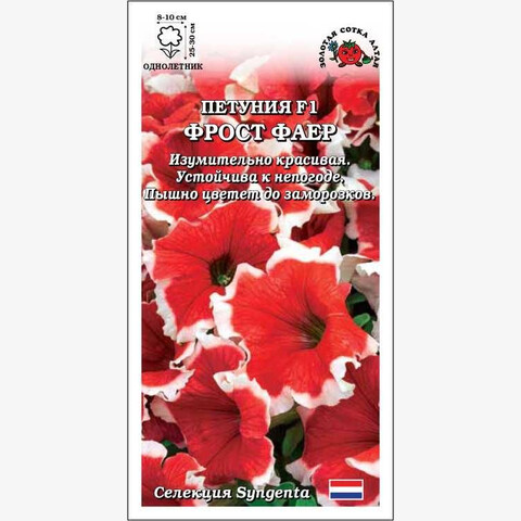 Изумительная по красоте петуния, притягивающая взоры контрастной расцветкой: снежно-белая кайма в сочетании с огненно-красным цветом венчика. Серия Фрост характеризуется компактностью и устойчивостью к любым капризам природы, зацветает рано и пышно цветет до заморозков. Непревзойденное украшение цветников, прекрасно развивается и цветет в контейнерах.
