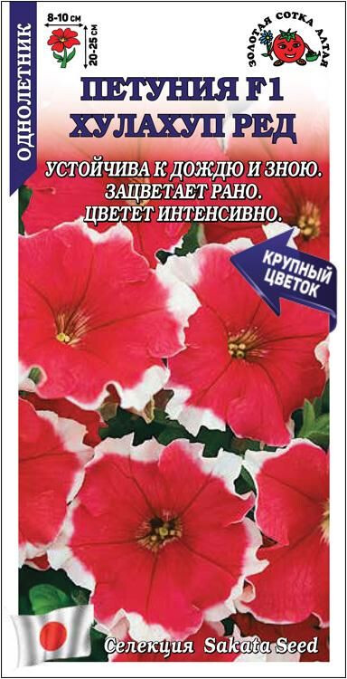 Гибриды серии Хулахуп зацветают очень рано, интенсивно цветут до заморозков, отлично переносят пересадку во взрослом состоянии, устойчивы к непогоде и палящему солнцу. Растения пышные, объемные, растут быстро и хорошо ветвятся. Цветы крупные, с волнистым краем, ярко-красные с белоснежным кантом. Петунии используются для украшения рабаток, клумб и бордюров, прекрасно растут в кашпо, вазонах и ящиках.