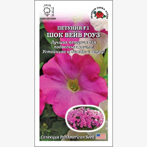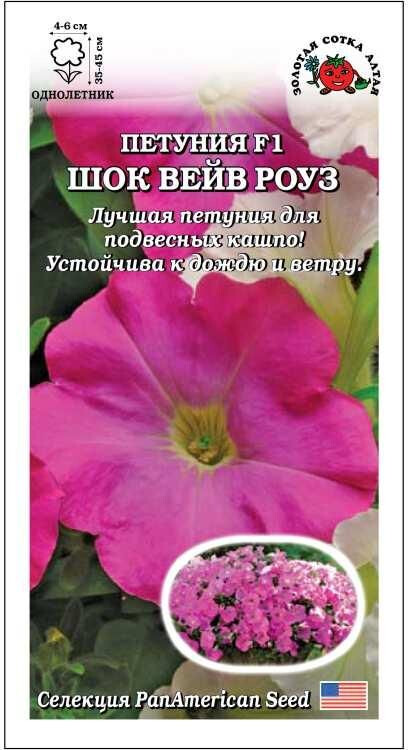 Очаровательная петуния высотой до 25 см, образующая при этом ниспадающие или расстилающиеся плети длиной 35-45 см, устойчива к дождю, жаре и сильному ветру. Многочисленные ароматные цветки окрашены в насыщенный розовый цвет. Петунии серии Шок Вейв – роскошное украшение подвесных кашпо и вазонов на высокой ножке, ковровых клумб и рабаток.