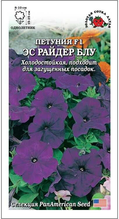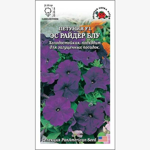 Петунии Эс Райдер высокоустойчивы к болезням, похолоданиям и непогоде, прекрасно подходят для загущенных посадок, пышно цветут до глубоких заморозков. Кустик компактный, шаровидный, диаметром 20-30 см, побеги крепкие, не вытягиваются и не нуждаются в прищипке. Цветы очень крупные, воронковидные, темно-синего цвета. Петунии этой серии наилучшим образом подходят для горшков, кашпо и ящиков, хороши в цветниках.