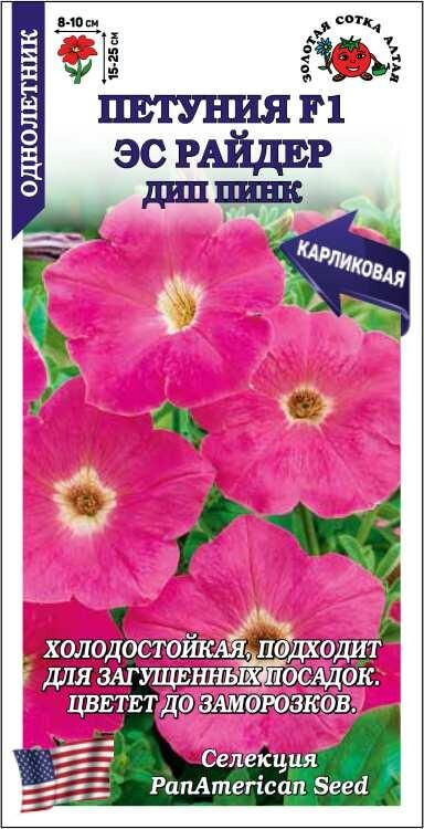 Петунии серии Эс Райдер очень холодостойкие, пышно цветут до глубоких заморозков, быстро восстанавливаются после дождя и ветра, высокоустойчивы к болезням, подходят для загущенных посадок. Кустик шаровидный, компактный, побеги крепкие, не вытягиваются. Цветы очень крупные, воронковидные, темно-розового цвета. Великолепное украшение любых контейнеров и цветников.