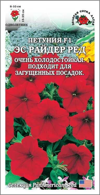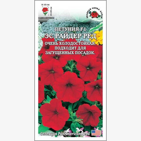 Петунии серии Эс Райдер высокоустойчивы к болезням, очень холодостойкие, пышно цветут до глубоких заморозков, быстро восстанавливаются после дождя и ветра, подходят для загущенных посадок. Кустик шаровидный, компактный. Побеги крепкие, не вытягиваются и не нуждаются в прищипке. Крупные красные цветы придают особое очарование различным цветникам и контейнерам.