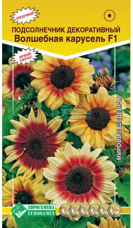 Сверхмодная культура для срезки! Это новое поколение всеми любимого декоративного подсолнечника, отличающегося неограниченным периодом роста и обильным цветением, один из лучших гибридов для создания живых изгородей. ВОЛШЕБНАЯ КАРУСЕЛЬ отличается крепкими растениями с крупными, очень яркими дисками, эффектно оттеняющими яркие желто-вишневые лепестки, образующими эффектные соцветия-корзинки. Игривые, веселые, насыщенные и задорные акценты подсолнечника преобразят даже самый скучный уголок сада. Культура неприхотливая, отлично украшающая сады и садовые участки. Для создания живой изгороди растения высаживают через 20-25 см друг от друга. Необычный, авангардный букет подсолнухов будет украшением интерьера более 2 недель. Высота растения-220 см Диаметр цветка-12-15 см