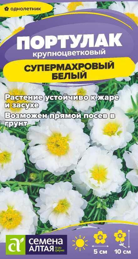 Великолепное низкорослое ползучее растение высотой около 10 см с мясистыми игловидными листиками и стеблями сизовато-зеленого цвета, иногда с багровым оттенком. Цепляясь за грунт, полностью покрывает участок или клумбу, образуя сплошной яркий ковер. Изюминка растения – белоснежные махровые цветки, напоминающие миниатюрную розу или пион. Цветки открываются в солнечную погоду, их цветение длится всего один день, на месте увядших цветков появляются новые. Засухоустойчивое, тепло- и светолюбивое растение, не цветет даже при легком затенении. Предпочитает сухие каменистые, песчаные или супесчаные бедные почвы. Выращивают посевом семян на рассаду в первой декаде апреля. Для прорастания семенам необходим свет, поэтому сеют поверхностно, лишь слегка вдавливая их в субстрат. Посевы увлажняют, накрывают пленкой и помещают в теплое светлое место, пленку периодически снимают для проветривания и удаления конденсата. При достаточном освещении и температуре воздуха +22-25°С всходы появляются через 7-15 дней, пленку убирают. Пикировку проводят, когда сформируется первая пара настоящих листовых пластин. В открытый грунт рассаду высаживают, когда минует угроза заморозков. Посадочное расстояние 25-30 см. Возможен прямой посев семян в грунт в первой половине мая, тогда молодым всходам может потребоваться дополнительная защита от заморозков или укрытие от прямого солнца, пока они не подрастут. Цветение непрерывное с июня до заморозков.
