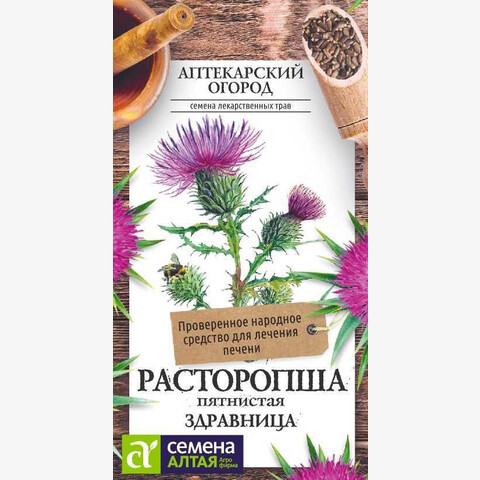 Однолетнее лекарственное и декоративное растение. Куст высотой до 150 см. Соцветия-корзинки диаметром 3-6 см. Цветки фиолетовые. Отвары из семян расторопши принимают при заболеваниях печени и желчного пузыря, гепатите, для похудения. Настой эффективен при варикозном расширении вен, заболеваниях желудочно-кишечного тракта, сердечнососудистой и репродуктивной систем организма. Кроме семян для лечения используют корень и листья. В пищу употребляют молодые листья и черенки. Для выращивания нужно выбирать хорошо освещенные и прогреваемые участки, избегая мест с образованием застойной влаги. Семена высевают осенью (сентябрь-октябрь) или весной (март-апрель) —на рассаду. Семенам требуется предварительная стратификация в течение 10-15 дней при температуре 5-7°С. Глубина заделки семян не более 0,5 см. При температуре 18-20°С всходы появляются на 10-14 день. Сеянцы пикируют в фазе 2-3 настоящих листьев. В открытый грунт высаживают через 4-6 недель. Для улучшения роста и продолжительного, обильного цветения рекомендуется проводить подкормки комплексными минеральными удобрениями.