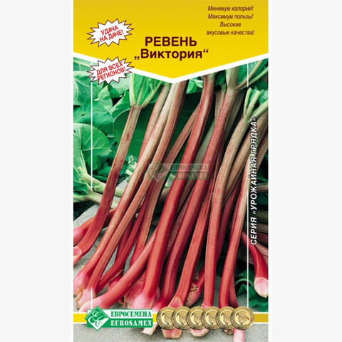 Ревень – одно из старейших травянистых и лечебных растений семейства Гречишные, насчитывающее около 50 видов и используемое в кулинарии и народной медицине. Родина огородного ревеня - Центральный Китай, где его культивируют со времён незапамятных. Это овощ, но готовится он как фрукт. Съедобен только стебель ревеня, листья и корень ревеня считаются ядовитыми. Зато стебель обладает нежным кислым вкусом и обычно его тушат в сахарном сиропе, сиропе из засахаренного имбиря и красно- смородинного желе. При этом он выделяет большое количество сока и поэтому почти не требует воды. Виктория- раннеспелый сорт с быстро отрастающими побегами. Черешки готовы к употреблению уже в мае. Розетка средней компактности. Лист яйцевидный, темно-зеленый. Черешок светло-зеленый со сплошной фиолетовой пигментацией у основания, без желобка. Длина до 50 см, ширина 2-2,5 см, масса черешка 25-80 г. Приятный кислый вкус. Используется в свежем виде, для приготовления киселей и консервирования. Рекомендуется для выращивания на садово-огородных участках с целью многолетней срезки.