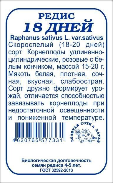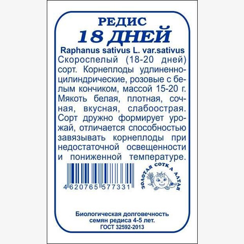 • Скороспелый сорт. От всходов до начала сбора урожая 18-20 дней. Корнеплоды цилиндрические, розовые с белым кончиком, массой 15-20 г. Мякоть плотная, сочная, вкусная. Сорт дружно формирует урожай, отличается способностью завязывать корнеплоды при недостаточной освещенности и пониженной температуре.
