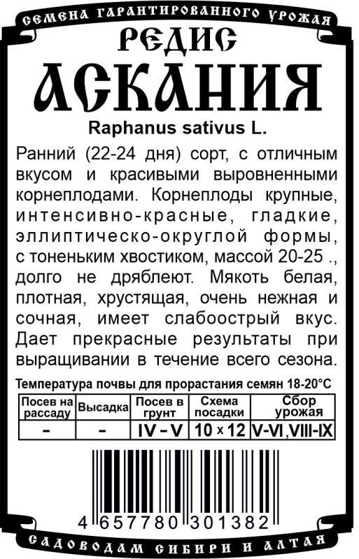 Ранний (22-24 дня) сорт, с отличным вкусом и красивыми выровненными корнеплодами. Корнеплоды крупные, интенсивно-красные, гладкие, эллиптическо-округлой формы, с тоненьким хвостиком, массой 20-25г., долго не дряблеют. Мякоть белая, плотная, хрустящая, очень нежная и сочная, имеет слабоострый вкус. Дает прекрасные результаты при выращивании в течение всего сезона.