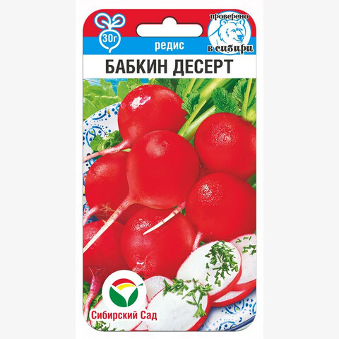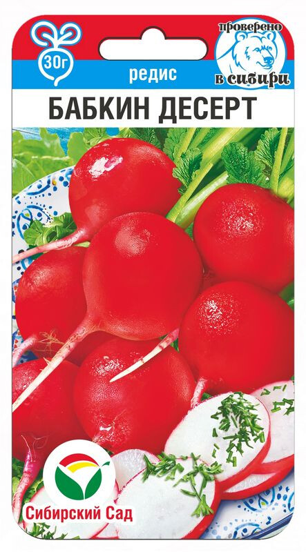 СЛАДКИЙ, РАННИЙ, КРУПНЫЙ. Всесезонный холодостойкий редис, пригодный для раннего посева в теплицы и позднего выращивания летом и осенью. Быстро формирует корнеплод даже в условиях низкой освещенности или жаркого лета. Ранний, 20-22 дня от посева. Компактная невысокая ботва. Большие ярко-красные корнеплоды, 20-30г, очень ровные, красивой круглой формы, без горечи и пустот. Не грубеют и не дрябнут в холодильнике. Мякоть белая, плотная, сочная, хрустящая, с прекрасными вкусовыми качествами. Высеваются на глубину 1,5 см. Хорошо растет на любой не слишком тяжелой почве. Самые крупные и лучшие по качеству корнеплоды получаются на освещенных и хорошо увлажненных участках. Требует равномерного полива на весь период вегетации и прореживания в начальный период роста.