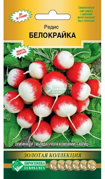 Ранней весной особенно сильно нас тянет к свежей зелени и овощам, но не к тепличным, а выращенным на своих огородах. Редис — один из первых весенних плодов, как радостный привет из наступающего лета, который появляется в нашем меню после долгой зимы, поэтому он является очень актуальным в начале весеннего периода. Только на первый взгляд редис кажется простым, на самом деле он обладает внушительным перечнем полезных свойств. Этот сочный, приятный на вид корнеплод со сладковатой остротой насыщает организм витаминно-минеральным комплексом, богат клетчаткой. Белокрайка- среднеспелый сорт редиса с красивой яркой окраской. Однородные корнеплоды шаровидной формы, округлые, розовые с белым кончиком, плоской головкой. Мякоть белая, нежная, сочная, масса корнеплода - 20-26 г. Урожайность 3,1-3,2 кг/м2. Сорт устойчив к растрескиванию. Хорошие вкусовые качества.