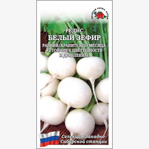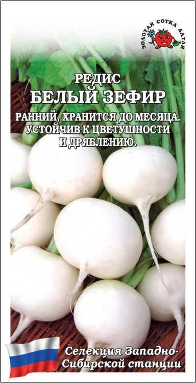 Раннеспелый сорт сибирской селекции. От всходов до созревания 20-23 дня. Розетка листьев полупрямостоячая. Корнеплоды округлые с плоской головкой, белые, массой 17-25 г. Мякоть белая, плотная, нежная и сочная, острого вкуса. Сорт устойчив к дряблению и цветушности. Хранится в холодильнике до 30-35 дней.