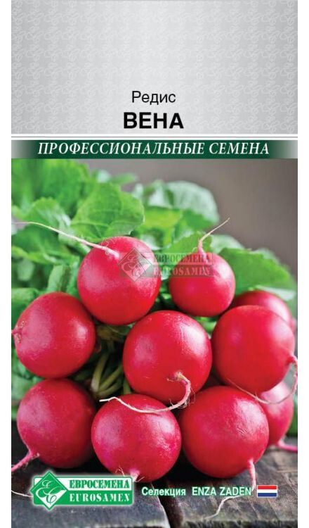 Ранней весной особенно сильно нас тянет к свежей зелени и овощам, но не к тепличным, а выращенным на своих огородах. Редис — один из первых весенних плодов, как радостный привет из наступающего лета, который появляется в нашем меню после долгой зимы, поэтому он является очень актуальным в начале весеннего периода. Только на первый взгляд редис кажется простым, на самом деле он обладает внушительным перечнем полезных свойств. Этот сочный, приятный на вид корнеплод со сладковатой остротой насыщает организм витаминно-минеральным комплексом, богат клетчаткой. Вена- среднеранний гибрид для всесезонного выращивания. Формирует крупные корнеплоды без пустот. Интенсивная окраска корнеплода и его блеск отлично сохраняются после мойки. Благодаря хорошему прикреплению листового аппарата к корнеплоду, отлично реализуется в пучках и на вес. Может выращиваться в пленочных теплицах весной и осенью, а также летом в открытом грунте. Сохраняет превосходное качество корнеплода при хранении в поле на корню, не растрескивается и не стрелкуется. Корнеплоды блестящие, круглой формы, ярко-красные с белоснежной внутренней структурой, размером 4-5 см в диаметре, массой 30-35 грамм. Мякоть нежная, сочная, без пустот.