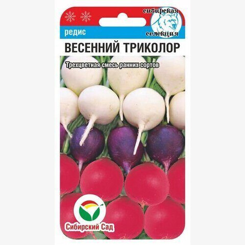 Трехцветная смесь ранних сортов редиса сибирской селекции с округлыми белыми, синими и ярко-красными корнеплодами массой 20-25 грамм. Все сорта обладают приятным сбалансированным вкусом. Горка разноцветных корнеплодов порадует глаз, придаст красивый вид и ядреный вкус свежим салатом и окрошке. Сорта достаточно устойчивы к стрелкованию, поэтому смесь можно выращивать в открытом грунте весной и в течении всего лета. Культура требует равномерного полива весь период вегетации растений и прореживания в начальный период роста.