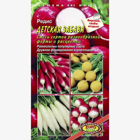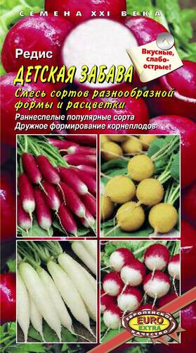 Смесь сортов разнообразной формы и расцветки Специально составленная смесь раннеспелых и среднеранних популярных сортов редиса. Детям будет интересно, посеяв семена, увидеть результат своего труда. Разнообразная форма и окраска корнеплодов сделает «игру в огородника» более увлекательной».