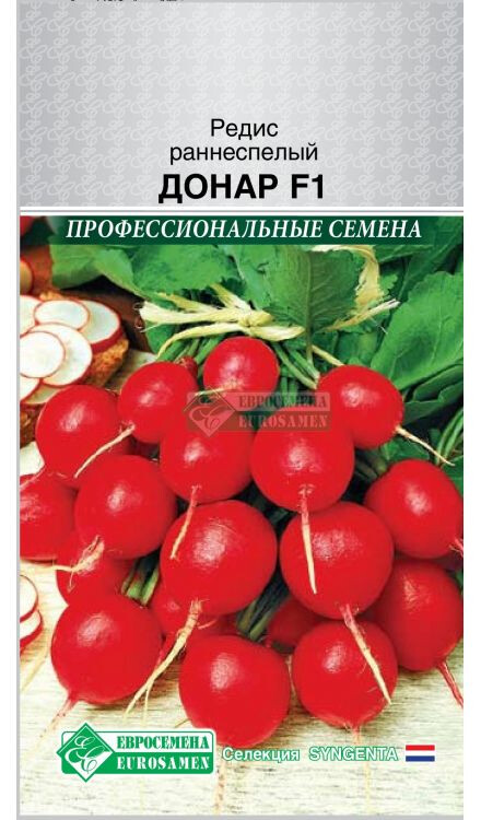 Первый, лучший на рынке среди редиса гибридного для потребления в свежем виде! Высокоурожайный гибрид отличных вкусовых качеств! Период от всходов до технической спелости 23-25 дней. Сорт рекомендуется для выращивания в пленочных теплицах, под укрытиями и в открытом грунте, пригоден для выращивания в условиях недостаточного освещения. Редис Донар F1 имеет короткий листовой аппарат, устойчив к пожелтению ботвы. Корнеплоды красивые, ярко-красного цвета, выровненные, шаровидной формы. Крупные и абсолютно одинаковые корнеплоды! Масса корнеплода 25 грамм, диаметр -3 см, мякоть сочная, без горечи. Отменный, аппетитный, сочный и хрустящий красавец редис на столе всегда кстати. Урожайность до 4 кг/кв². Болезнеустойчивый гибрид, идеальная температура для выращивания 16-22 градуса.