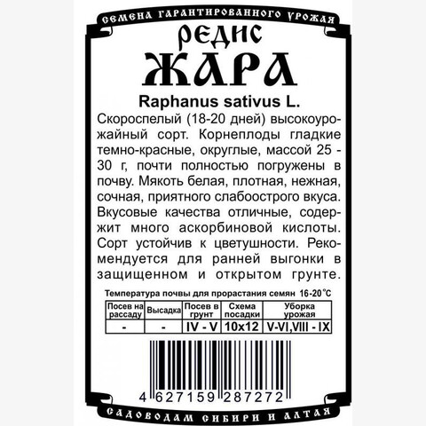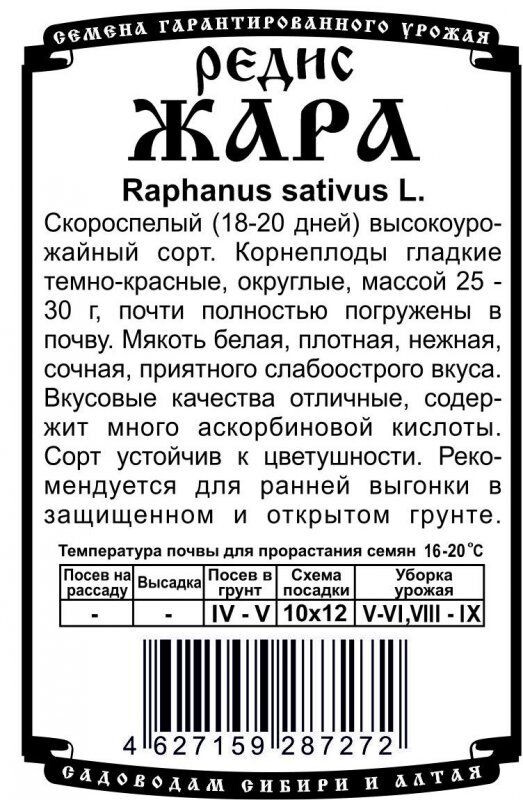 Скороспелый (18-20 дней) высокоурожайный сорт. Корнеплоды гладкие темно-красные, округлые, массой 25 -30 г, почти полностью погружены в почву. Мякоть белая, плотная, нежная, сочная, приятного слабоострого вкуса. Вкусовые качества отличные, содержит много аскорбиновой кислоты. Сорт устойчив к цветушности. Рекомендуется для ранней выгонки в защищенном и открытом грунте.