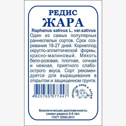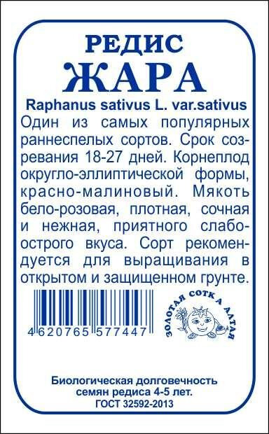 • Один из самых популярных раннеспелых сортов. От полных всходов до сбора урожая 18-27 дней. Корнеплоды красно-малиновые, округло-эллиптической формы. Мякоть бело-розовая, плотная, сочная, слабоострого вкуса. Сорт рекомендуется для выращивания в открытом и защищенном грунте.