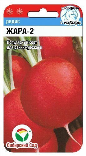 Полученная на основе селекционного отбора разновидность раннеспелого сорта Жара. Сохраняя все достоинства любимого всеми сорта, Жара-2 имеет более крупные корнеплоды (до 50% массы). Сорт ранний, от всходов до технической спелости 20-25 дней. Корнеплоды округлые, красно-малиновой окраски, с белой плотной мякотью, слабоострого вкуса. Не дрябнут. Рекоменддован для повсеместного выращивания.