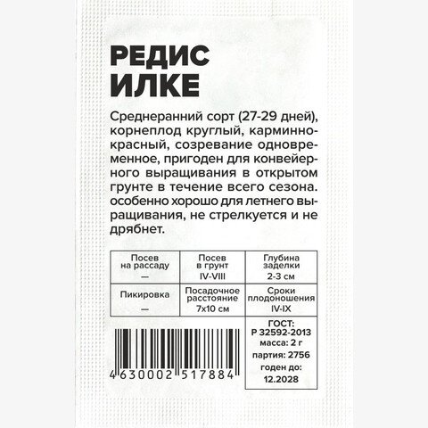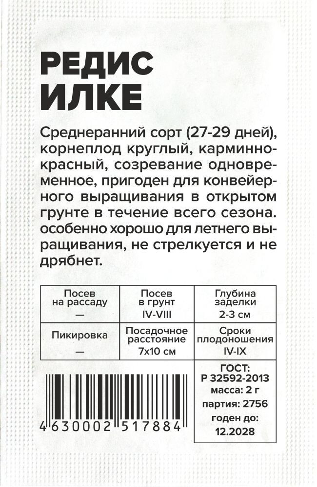 Среднеранний (27-29 дней) сорт. Корнеплод округлый, карминно-красный, созревание одновременное, пригоден для конвейерного выращивания в открытом грунте в течение всего сезона. Особенно хорошо для летнего выращивания, не стрелкуется и не дрябнет. Место посадки: рыхлые плодородные нейтральные почвы. Размещают после огурцов, томатов, перца, лука, укропа, петрушки. Не рекомендовано сеять после крестоцветных Освещение: обильное, в глубокой тени дает длинную ботву и маленький корнеплод Предпосевная подготовка: не требуется Сроки посева: при прогревании почвы до 4-6°C (март-май). Можно сеять несколько раз за сезон. В неотапливаемой теплице первый посев проводят также при прогревании почвы. Допускается посев под зиму. При посеве учитывать, что растение не выносит высокую температуру воздуха (выше 30°C начинает стрелковаться) Посев на рассаду: не предусмотрено Посев в грунт: сеют в борозды, семена раскладывают на увлажненный грунт в бороздки глубиной 1,5-2,5 см, присыпают землей, уплотняют, обильно поливают. Посевы рекомендовано накрывать укрывным материалом до развития первых настоящих листьев. Расстояние между растениями 5-7 см, междурядья 10-15 см Пикировка/перевалка: не предусмотрена Уход: при проявлении первого настоящего листа всходы прореживают, оставляя расстояние между растениями 6-8 см. Использование свежих органических удобрений под редис не рекомендуется, так как они вызывают дуплистость и загнивание корнеплода