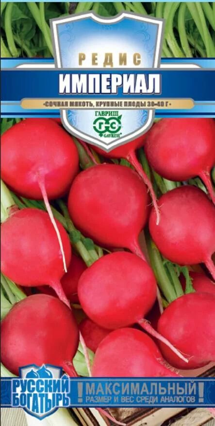 Редис — один из первых весенних плодов, которые появляются в нашем меню после долгой зимы. Это сочный, приятный на вид плод со сладковатой остротой, богат клетчаткой и витаминами. Сорт среднеспелый, через 25-30 дней можно собирать первый урожай очень крупных корнеплодов. Красные плоды имеют округлую форму диаметром 8-10 см и массой 30-40 г, с белой, хрустящей мякотью. Вкусовые качества отменные. Используют в свежем виде: нарезке, салатах, окрошке. Из редиски готовят закуски, бутерброды. Сорт относительно устойчив к болезням. Посев в грунт проводится в конце апреля-начале мая, июле на глубину 1 см по схеме 5-7x15 см. Урожайность 3,2-3,4 кг/м2.