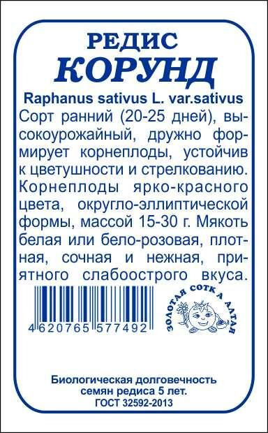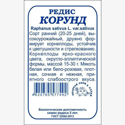 • Раннеспелый высокоурожайный сорт с дружным формированием корнеплодов. От полных всходов до начала сбора урожая 20-25 дней. Корнеплоды округло-эллиптической формы, ярко-красного цвета, массой 15-30 г. Мякоть белая или бело-розовая, плотная, сочная, нежная, приятного слабоострого вкуса. Сорт устойчив к цветушности и стрелкованию.