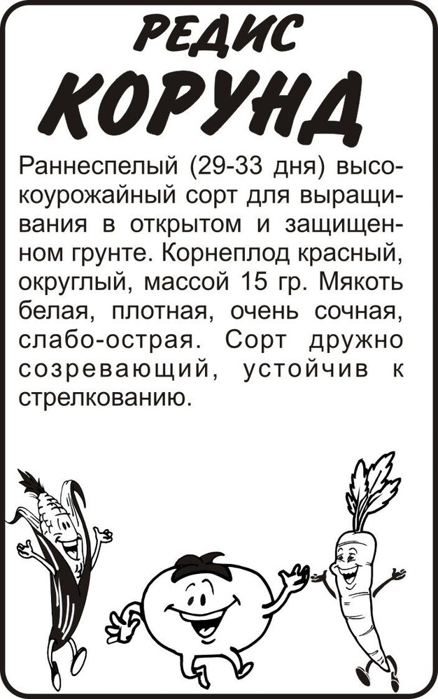 Раннеспелый (29-33 дня) высокоурожайный сорт для выращивания в открытом и защищенном грунте. Корнеплод красный, округлый, массой 15 г. Мякоть белая, плотная, очень сочная, слабо-острая. Сорт дружно созревающий, устойчив к стрелкованию. Место посадки: рыхлые плодородные нейтральные почвы. Размещают после огурцов, томатов, перца, лука, укропа, петрушки. Не рекомендовано сеять после крестоцветных Освещение: обильное, в глубокой тени дает длинную ботву и маленький корнеплод Предпосевная подготовка: не требуется Сроки посева: при прогревании почвы до 4-6°C (март-май). Можно сеять несколько раз за сезон. В неотапливаемой теплице первый посев проводят также при прогревании почвы. Допускается посев под зиму. При посеве учитывать, что растение не выносит высокую температуру воздуха (выше 30°C начинает стрелковаться) Посев на рассаду: не предусмотрено Посев в грунт: сеют в борозды, семена раскладывают на увлажненный грунт в бороздки глубиной 1,5-2,5 см, присыпают землей, уплотняют, обильно поливают. Посевы рекомендовано накрывать укрывным материалом до развития первых настоящих листьев. Расстояние между растениями 5-7 см, междурядья 10-15 см Пикировка/перевалка: не предусмотрена Уход: при проявлении первого настоящего листа всходы прореживают, оставляя расстояние между растениями 6-8 см. Использование свежих органических удобрений под редис не рекомендуется, так как они вызывают дуплистость и загнивание корнеплода