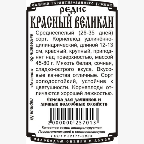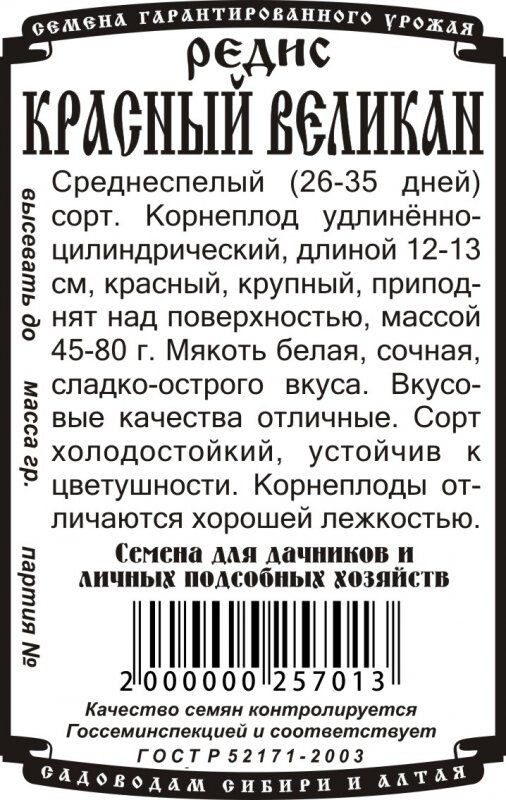 Среднеспелый (26-35 дней) сорт. Корнеплод удлинённо-цилиндрический, длиной 12-13 см, красный, крупный, приподнят над поверхностью, массой 45-80 г.Мякоть белая, сочная, сладко-острого вкуса. Вкусовые качества отличные. Сорт холодостойкий, устойчив к цветушности. Корнеплоды отличаются хорошей лежкостью.