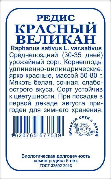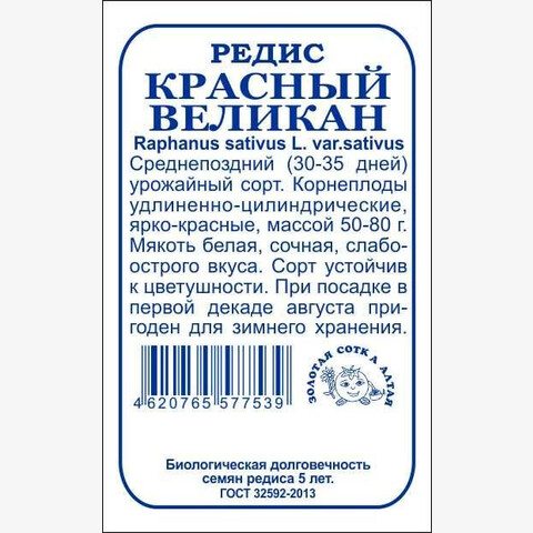 Среднепоздний высокоурожайный сорт, устойчивый к цветушности. Корнеплоды удлиненно-цилиндрические, ярко-красные, длиной12-13 см, массой 50-80 г (до 150 г). Мякоть белая, сочная, хрустящая, приятного слабоострого вкуса, долго не дрябнет. При посадке впервой декаде августа корнеплоды пригодны для хранения в течение 3-4 месяцев.