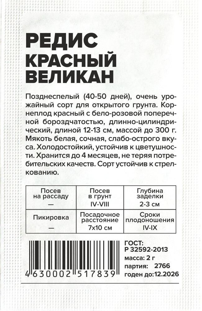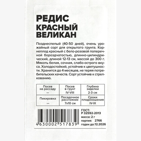 Позднеспелый (40-50 дней) очень урожайный сорт для открытого грунта. Корнеплод красный с бело-розовой поперечной бороздчатостью, длинно-цилиндрический, длиной 12-13 см, массой до 300 г. Мякоть белая, сочная, слабо-острого вкуса. Холодостойкий, устойчив к цветушности. Хранится до 4 месяцев, не теряя потребительских качеств. Сорт устойчив к стрелкованию. Место посадки: рыхлые плодородные нейтральные почвы. Размещают после огурцов, томатов, перца, лука, укропа, петрушки. Не рекомендовано сеять после крестоцветных Освещение: обильное, в глубокой тени дает длинную ботву и маленький корнеплод Предпосевная подготовка: не требуется Сроки посева: при прогревании почвы до 4-6°C (март-май). Можно сеять несколько раз за сезон. В неотапливаемой теплице первый посев проводят также при прогревании почвы. Допускается посев под зиму. При посеве учитывать, что растение не выносит высокую температуру воздуха (выше 30°C начинает стрелковаться) Посев на рассаду: не предусмотрено Посев в грунт: сеют в борозды, семена раскладывают на увлажненный грунт в бороздки глубиной 1,5-2,5 см, присыпают землей, уплотняют, обильно поливают. Посевы рекомендовано накрывать укрывным материалом до развития первых настоящих листьев. Расстояние между растениями 5-7 см, междурядья 10-15 см Пикировка/перевалка: не предусмотрена Уход: при проявлении первого настоящего листа всходы прореживают, оставляя расстояние между растениями 6-8 см. Использование свежих органических удобрений под редис не рекомендуется, так как они вызывают дуплистость и загнивание корнеплода