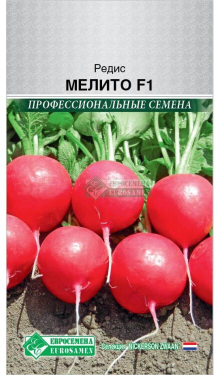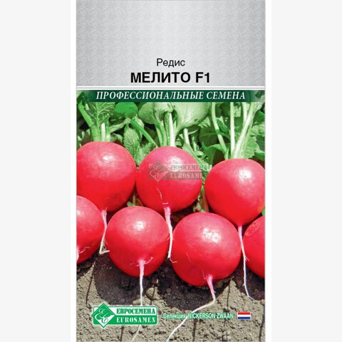 Редис Мелито F1 –очень ранний гибрид-красавец от голландской компании Hazera (Nickerson Zwaan BV), крепкий и здоровый. Удачно сочетает раннеспелость с высоким выходом товарной продукции. Отличается от известных сортов отличным качеством продукции, транспортабельностью и устойчивостью к болезням, рекомендуется для раннего производства в пучках и предпочитает укороченный день, но неплохо переносит и жару. Корнеплоды нарядные, ярко-красные, выровненные, будто откалиброванные (4 см в диаметре), с белоснежной сочной хрустящей мякотью, без пустот, очень приятного гармоничного вкуса весенней свежести. Хорошо адаптируется к любой погоде. Отличная устойчивость к стрелкованию и растрескиванию, к ложной мучнистой росе (IR).