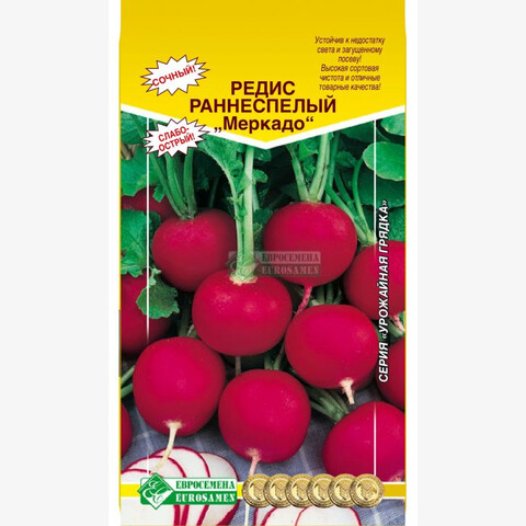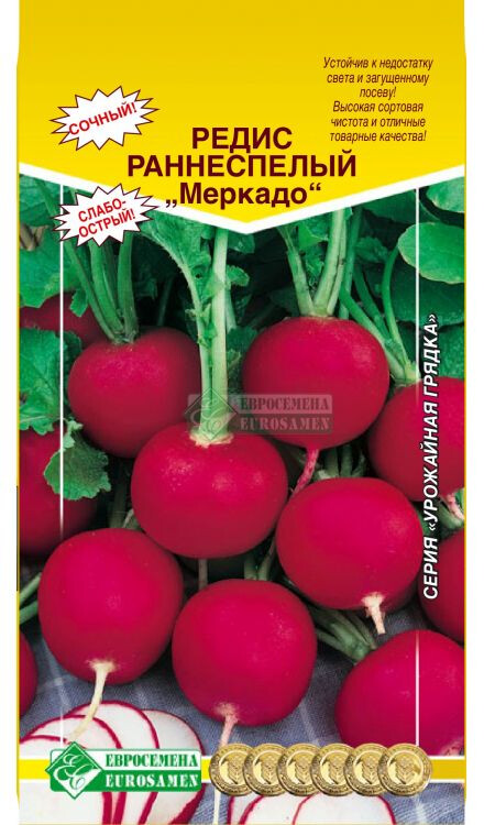 Хороший сорт для любых условий выращивания! В салатах красавец, на вкус еще лучше. В меру острый, нет горечи и очень сочный. Раннеспелый сорт, период от полных всходов до начала технической спелости 25-30 дней. Розетка листьев средней длины, полупрямостоячая. Корнеплоды выровненные, округлой и округло-плоской формы, насыщено-красного цвета. Осевой корешок тонкий. Мякоть белая, плотная, сочная, сладкая, слабоострого вкуса. Масса товарного корнеплода 20-25 г. Вкусовые качества отличные. Средняя урожайность 3,0 – 4,2 кг/м2. Сорт подходит для весеннего выращивания в защищенном грунте. Характеризуется высокой сортовой чистотой и отличными внешними товарными качествами. Устойчив к недостатку света и загущенному посеву.
