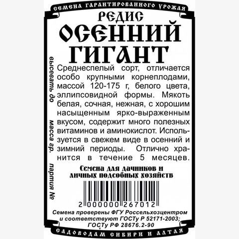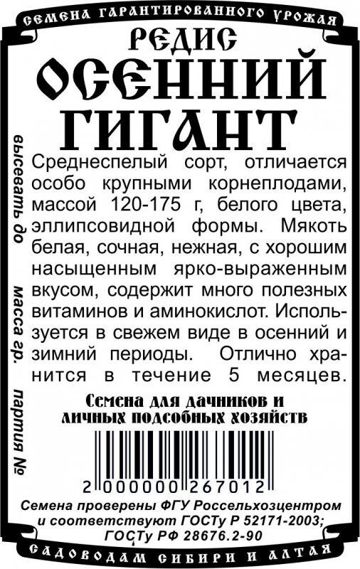 Среднеспелый сорт, отличается особо крупными корнеплодами, массой 120-175г, белого цвета, эллипсовидной формы. Мякоть белая, сочная, нежная, с хорошим насыщенным ярко-выраженным вкусом, содержит много полезных витаминов и аминокислот. Используется в свежем виде в осенний и зимний периоды. Отлично хранится в течение 5 месяцев.