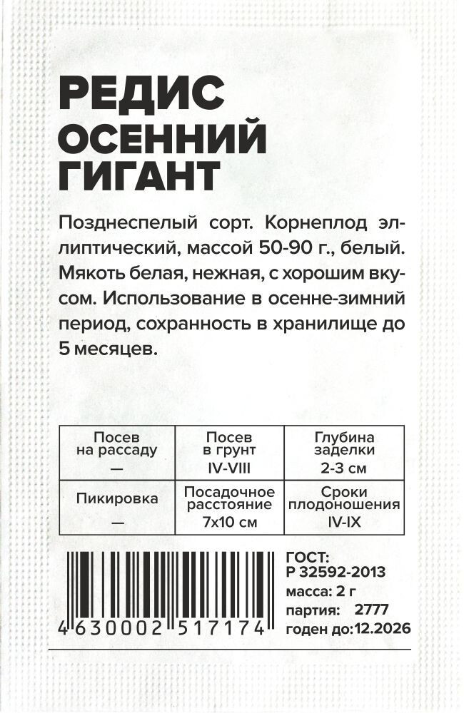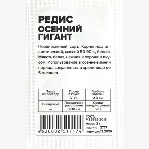 Позднеспелый сорт. Корнеплод эллиптический, белый, массой 50-90 г. Мякоть белая, очень нежная, сочная, с гармоничным слабоострым вкусом. Подходит для использования в осенне-зимний период, так как обладает прекрасной лежкостью, может храниться до 5 месяцев. Место посадки: рыхлые плодородные нейтральные почвы. Размещают после огурцов, томатов, перца, лука, укропа, петрушки. Не рекомендовано сеять после крестоцветных Освещение: обильное, в глубокой тени дает длинную ботву и маленький корнеплод Предпосевная подготовка: не требуется Сроки посева: при прогревании почвы до 4-6°C (март-май). Можно сеять несколько раз за сезон. В неотапливаемой теплице первый посев проводят также при прогревании почвы. Допускается посев под зиму. При посеве учитывать, что растение не выносит высокую температуру воздуха (выше 30°C начинает стрелковаться) Посев на рассаду: не предусмотрено Посев в грунт: сеют в борозды, семена раскладывают на увлажненный грунт в бороздки глубиной 1,5-2,5 см, присыпают землей, уплотняют, обильно поливают. Посевы рекомендовано накрывать укрывным материалом до развития первых настоящих листьев. Расстояние между растениями 5-7 см, междурядья 10-15 см Пикировка/перевалка: не предусмотрена Уход: при проявлении первого настоящего листа всходы прореживают, оставляя расстояние между растениями 6-8 см. Использование свежих органических удобрений под редис не рекомендуется, так как они вызывают дуплистость и загнивание корнеплода
