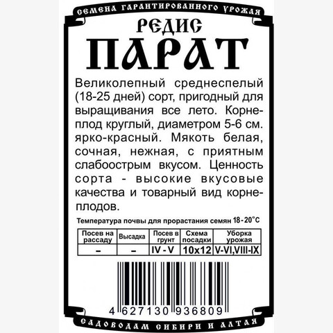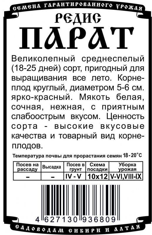 Великолепный среднеспелый (18-25 дней) сорт, пригодный для выращивания все лето. Корнеплод круглый, диаметром 5-6 см. ярко-красный. Мякоть белая, сочная, нежная, с приятным слабоострым вкусом. Ценность сорта - высокие вкусовые качества и товарный вид корнеплодов.