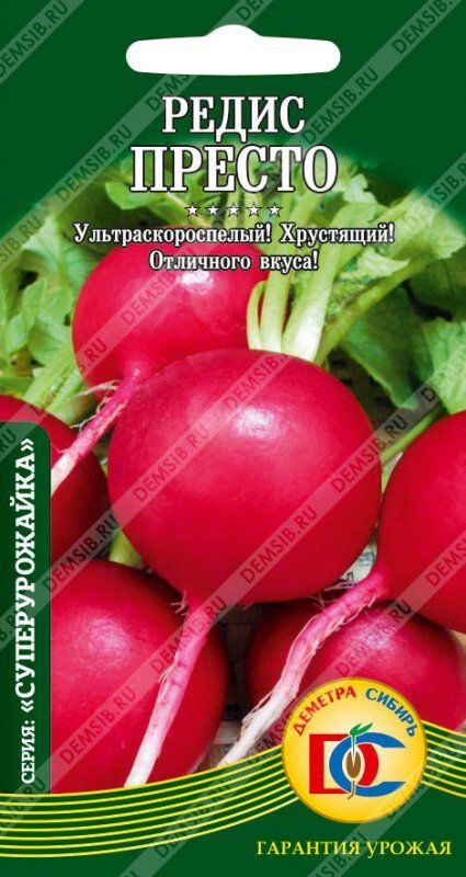 • Ультраскороспелый (16-18 дней) сорт. Розетка листьев прямостоячая. Корнеплод ярко-красный, округлой формы, массой 10-15 г. Мякоть белая, нежная, очень сочная. Не дрябнет, не растрескивается. Устойчив к цветушности.