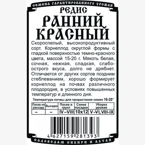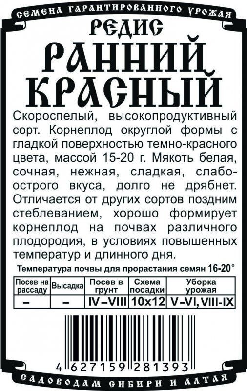 Скороспелый, высокопродуктивный сорт. Корнеплод округлой формы с гладкой поверхностью темно-красного цвета, массой 15-20 г. Мякоть белая, сочная, нежная, сладкая, слабо-острого вкуса, долго не дрябнет. Отличается от других сортов поздним стеблеванием, хорошо формирует корнеплод на почвах различного плодородия, в условиях повышенных температур и длинного дня.