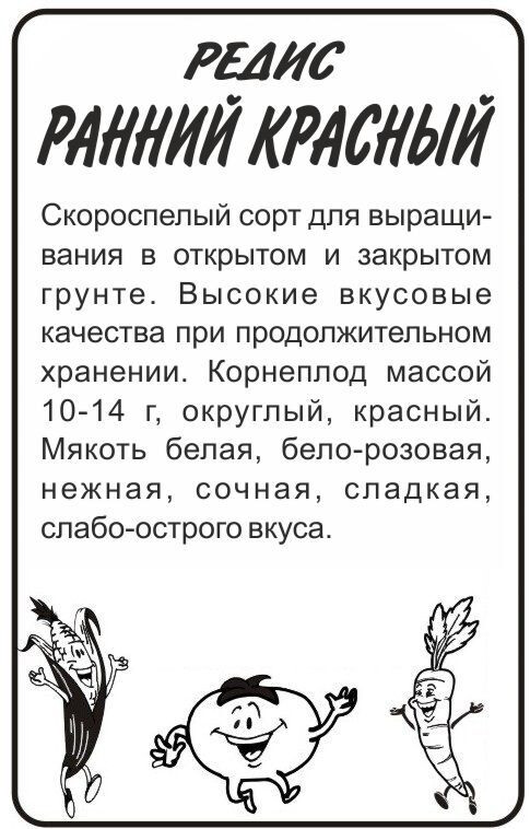Скороспелый сорт для выращивания в открытом и закрытом грунте. Высокие вкусовые качества при продолжительном хранении. Корнеплод массой 10-14 г, округлый, красный. Мякоть белая, бело-розовая, нежная, сочная, сладкая, слабоострого вкуса. Сохраняет высокие вкусовые качества при продолжительном хранении. Место посадки: рыхлые плодородные нейтральные почвы. Размещают после огурцов, томатов, перца, лука, укропа, петрушки. Не рекомендовано сеять после крестоцветных Освещение: обильное, в глубокой тени дает длинную ботву и маленький корнеплод Предпосевная подготовка: не требуется Сроки посева: при прогревании почвы до 4-6°C (март-май). Можно сеять несколько раз за сезон. В неотапливаемой теплице первый посев проводят также при прогревании почвы. Допускается посев под зиму. При посеве учитывать, что растение не выносит высокую температуру воздуха (выше 30°C начинает стрелковаться) Посев на рассаду: не предусмотрено Посев в грунт: сеют в борозды, семена раскладывают на увлажненный грунт в бороздки глубиной 1,5-2,5 см, присыпают землей, уплотняют, обильно поливают. Посевы рекомендовано накрывать укрывным материалом до развития первых настоящих листьев. Расстояние между растениями 5-7 см, междурядья 10-15 см Пикировка/перевалка: не предусмотрена Уход: при проявлении первого настоящего листа всходы прореживают, оставляя расстояние между растениями 6-8 см. Использование свежих органических удобрений под редис не рекомендуется, так как они вызывают дуплистость и загнивание корнеплода