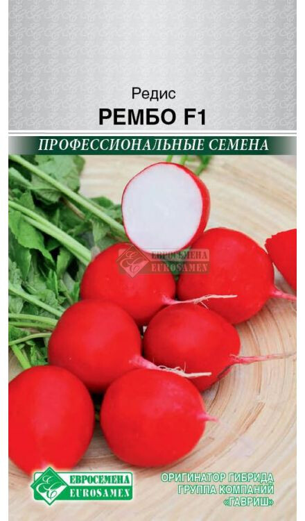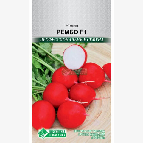 Ранней весной особенно сильно нас тянет к свежей зелени и овощам, но не к тепличным, а выращенным на своих огородах. Редис — один из первых весенних плодов, как радостный привет из наступающего лета, который появляется в нашем меню после долгой зимы, поэтому он является очень актуальным в начале весеннего периода. Только на первый взгляд редис кажется простым, на самом деле он обладает внушительным перечнем полезных свойств. Этот сочный, приятный на вид корнеплод со сладковатой остротой насыщает организм витаминно-минеральным комплексом, богат клетчаткой. Рембо- раннеспелый гибрид редиса, высокоурожайный для выращивания в открытом грунте и пленочных теплицах. Корнеплоды высоких вкусовых качеств, очень выровненные, округлые, до 3,5 см в диаметре, красные, головка плоская. Мякоть белая, нежная, сочная. Масса корнеплода до 25-28 г. Крупные однородные ярко окрашенные корнеплоды, которые могут храниться продолжительное время. Устойчивость хорошая к растрескиванию и цветушности, к условиям холода и повышенной влажности, а также к жаркому климату. Вкусовые качества отличные.